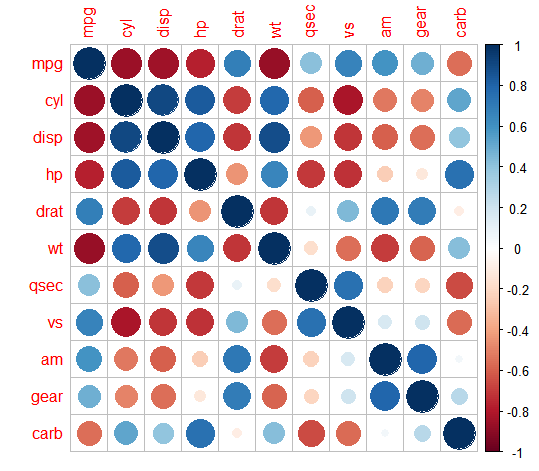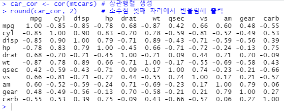 R에 내장된 mtcars 데이터를 이용해 상관 행렬을 만들어보자.