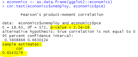 p-value가 0.5 미만이고, 상관계수(cor)가 양수이기 때문에